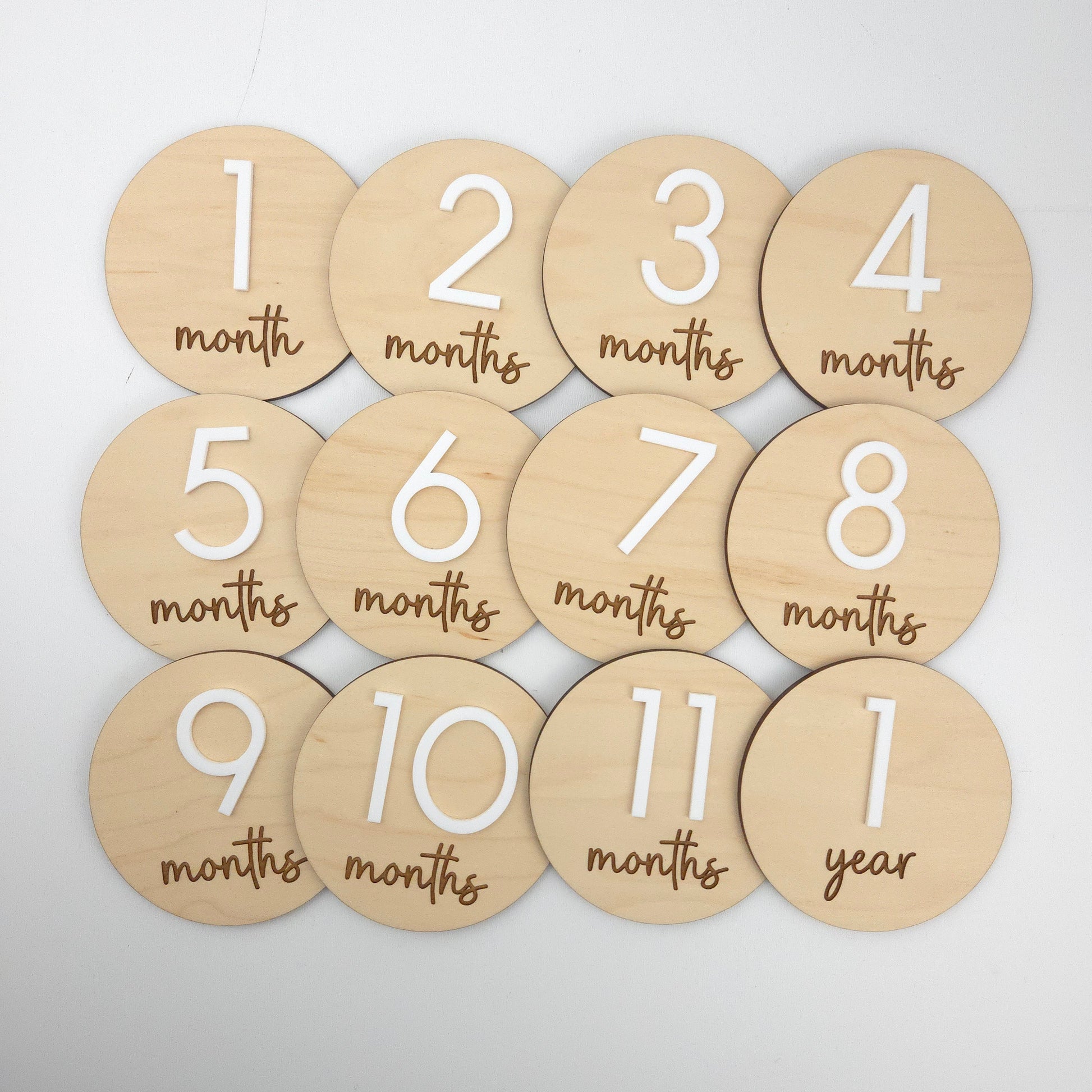 Celebrate your baby’s growth with these charming wooden Monthly Milestone discs! Perfect as photo props, each disc features numbers cut from vibrant colored acrylic, paired with beautifully engraved modern cursive wording for a delightful touch.