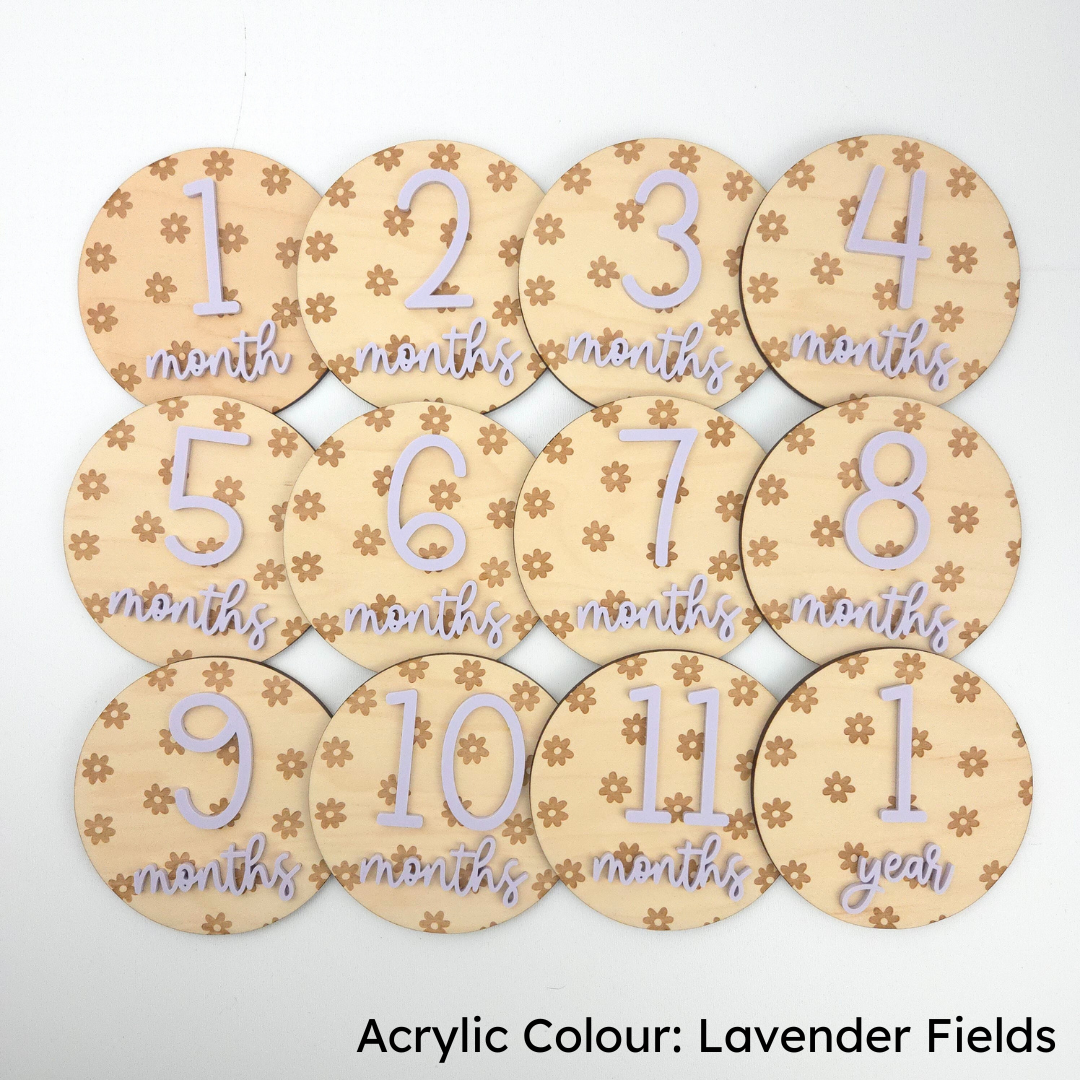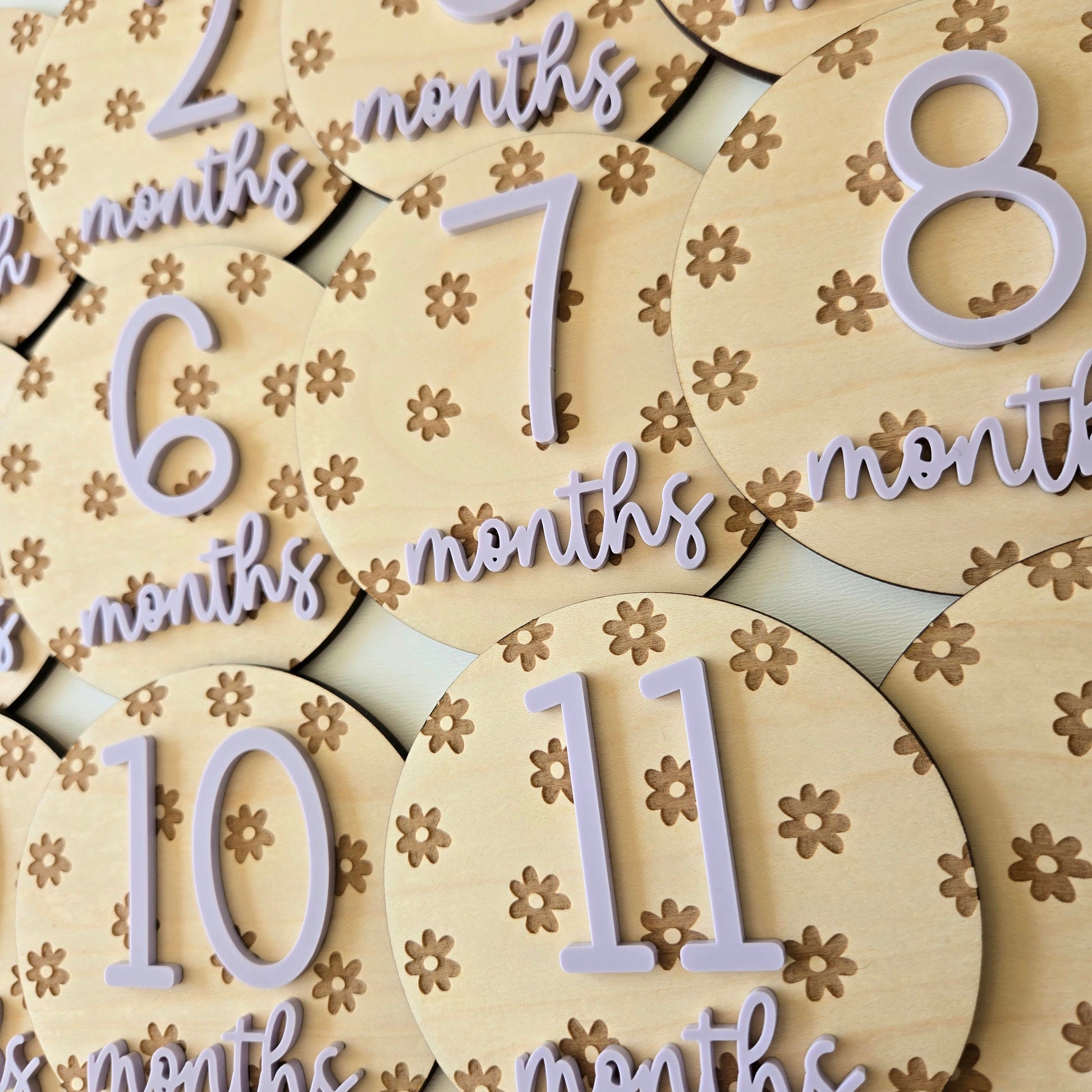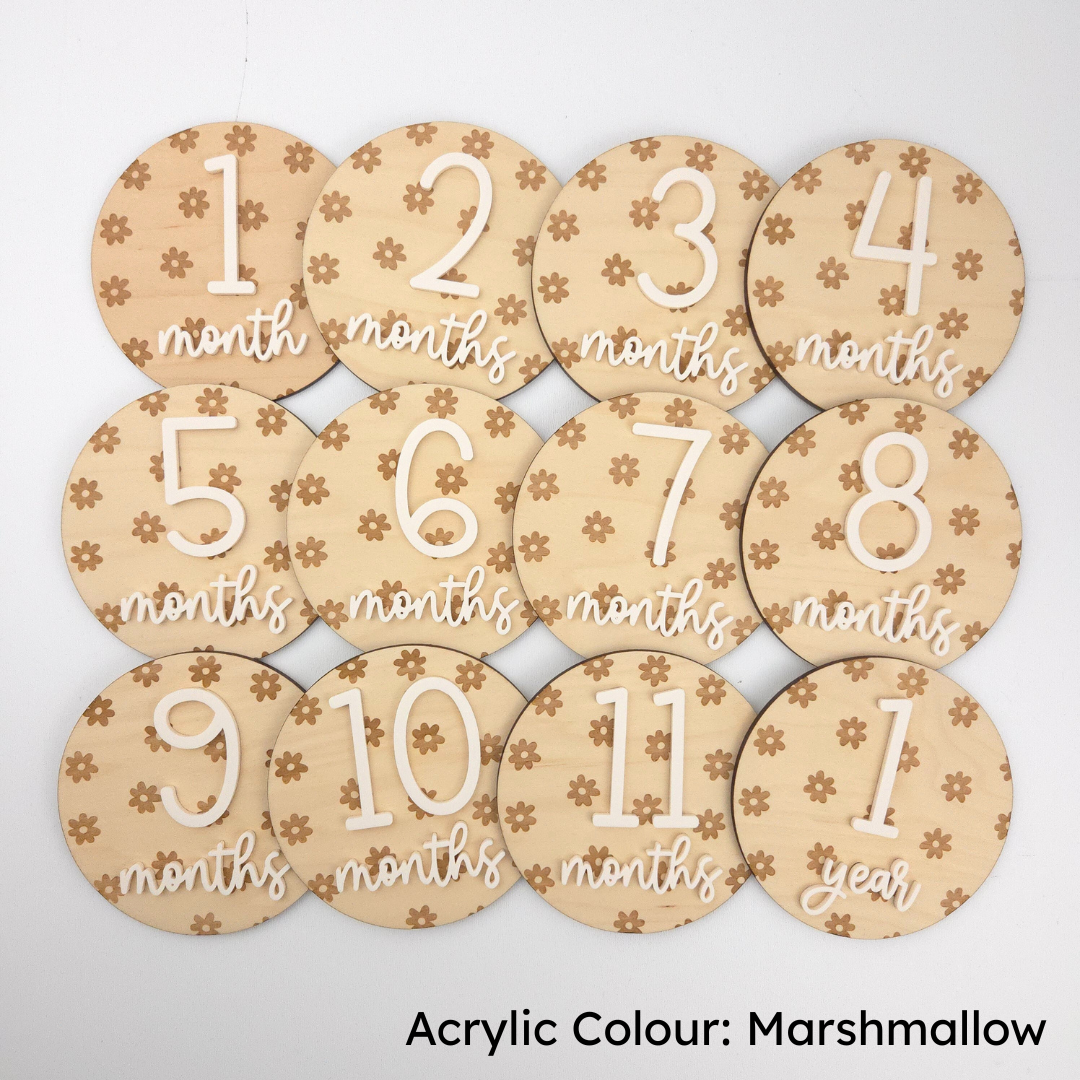 Celebrate each month of your baby's journey with the "Isla" Monthly Milestones set. Featuring engraved floral patterns with vibrant acrylic numbers and words layered on top, this playful design adds charm to every milestone photo. A delightful way to track growth while creating sweet keepsakes!