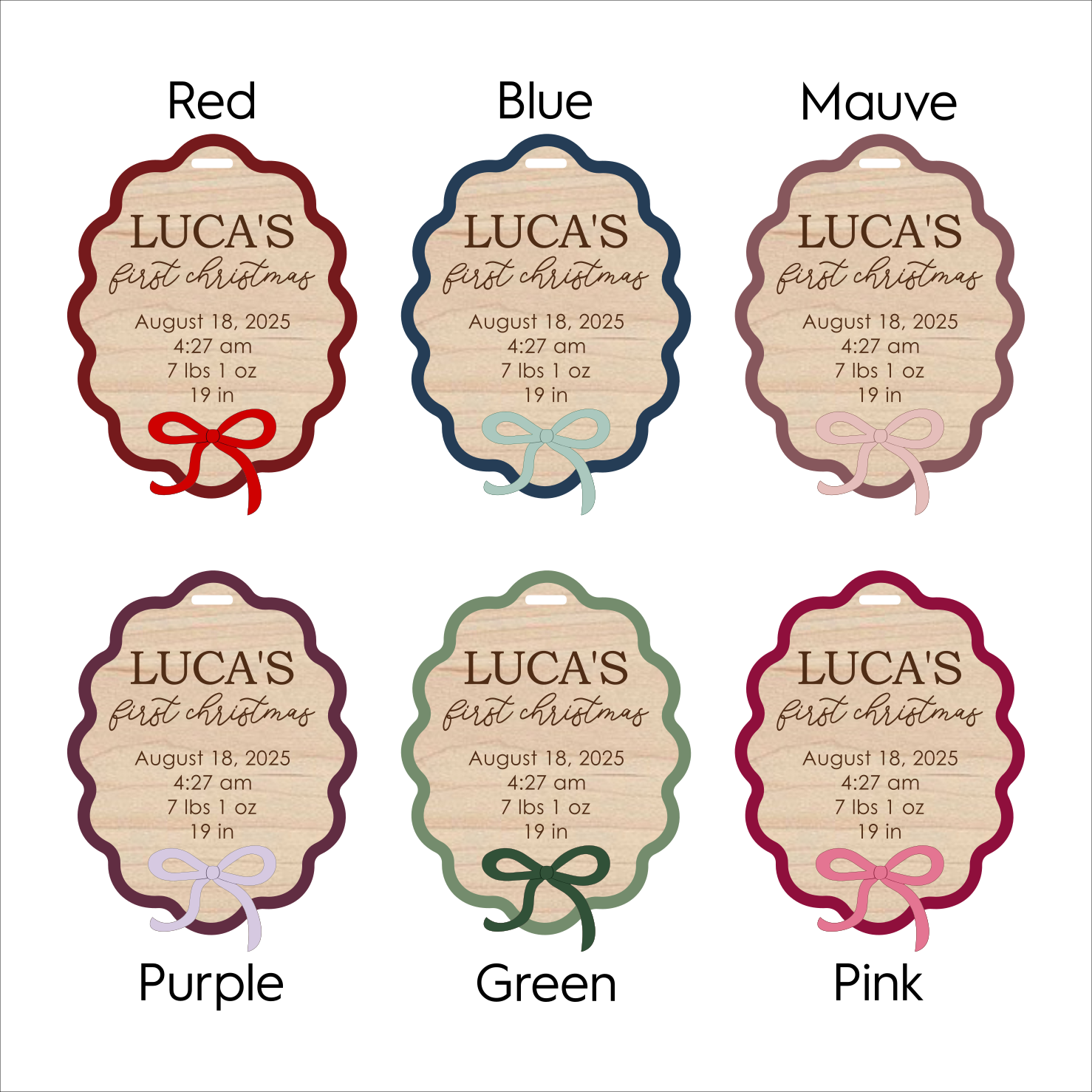 Welcome baby's first Christmas with this enchanting ornament featuring a scalloped frame that beautifully showcases your little one's birth stats—date, weight, and more. Topped with a charming bow, this personalized keepsake transforms precious details into a timeless decoration.